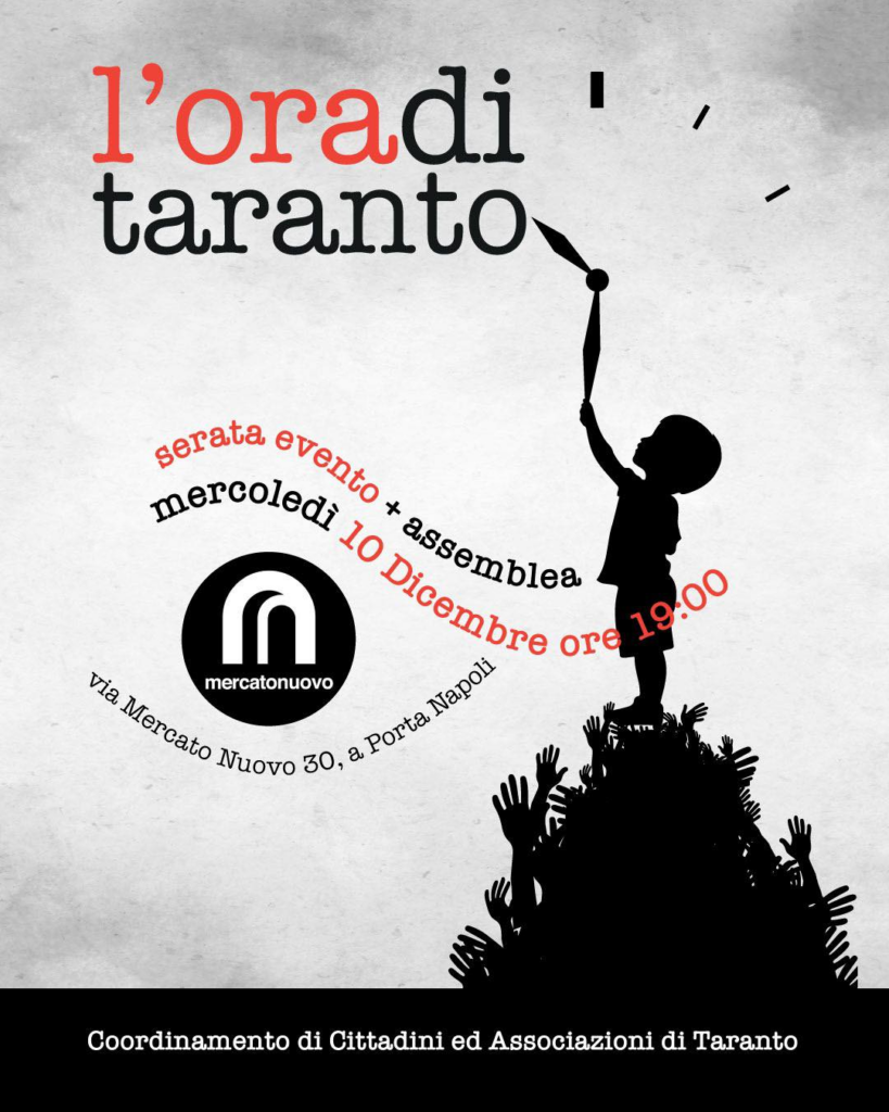 Rivivremo insieme le emozioni della manifestazione L’Ora di Taranto nel video ufficiale realizzato da Antonello Cafagna (35’) e a seguire ci confronteremo nell’assemblea di restituzione nella quale condivideremo i prossimi passi da intraprendere nel percorso collettivo che stiamo portando avanti per il nostro territorio.